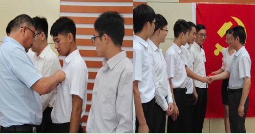 党委书记林艳书同志带领新党员面对鲜红的党旗,紧握右拳,以饱满的精神状态、洪亮的声音进行庄严的入党宣誓。表明他们为党和国家奋斗终身的坚定决心和对中国共产党忠贞不渝的革命热情。之后,林艳书书记和王敏达副书记为新党员佩带党徽,这代表着他们有了一个光荣的身份——