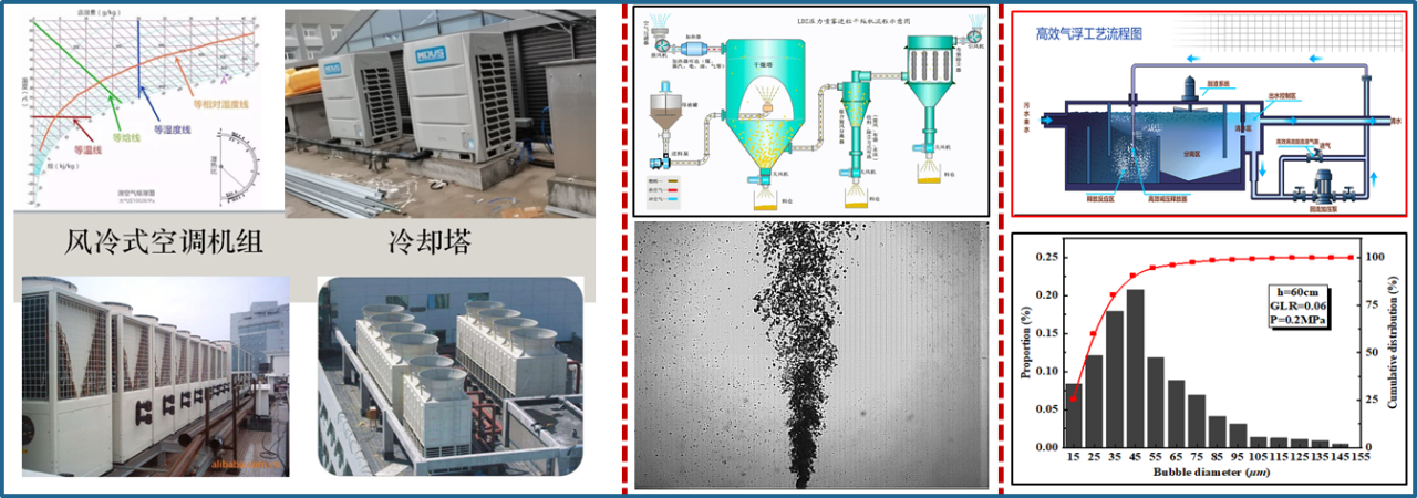 喷雾冷却技术可提高风冷空调机组的制冷性能系数(15%-35%);喷雾干燥技术可大大提高传热传质效率、降低干燥脱水能耗;微纳米气泡形成可以去除水中悬浮物或污染物。