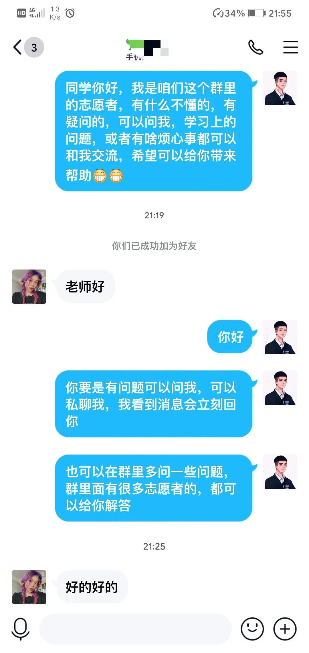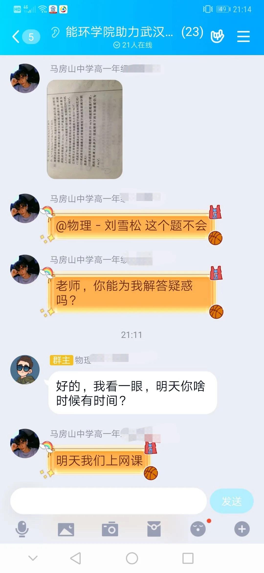 能环志愿者和学生们也通过QQ、微信等通讯工具交流学习问题,同时也建立起了友谊。尽职尽责的能环志愿者们不仅认真照看学生的学习情况,也细心呵护他们的坚强的小心灵,为奋战在武汉一线的医护家长减轻了负担,给了他们更多的力量。