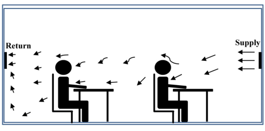 夏季工况下,层式通风是一种高温空调形式:冷空气被安装于侧壁或柱中的末端送风装置直接分配至呼吸区域,同时,老化空气被处于同一高度或贴近地面的末端排风装置带走,如图1示意图所示。