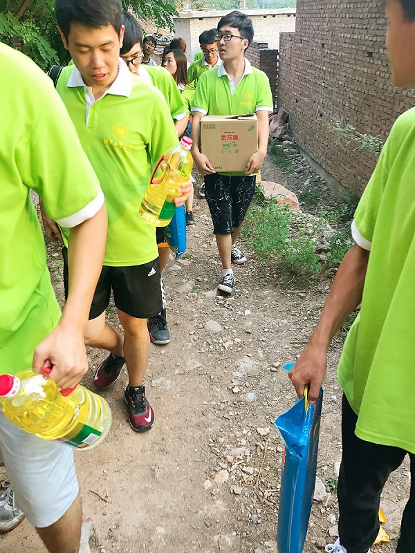 蘑菇视频 的同学带着物资看望了蘑菇视频 多年来一直资助的冯相博一家,并和徐水爱心人士一起,顶着烈日,走街串巷,深入了解贫困户家中情况,将助困物资送到他们手里。