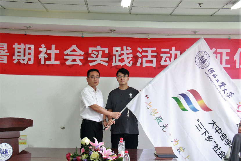 赵庚书记和王敏达书记分别为“七彩微光 为爱上色”大学生支教团、“爱老信使”实践队、新能源精准扶贫实践队三支社会实践重点队进行了授旗仪式。