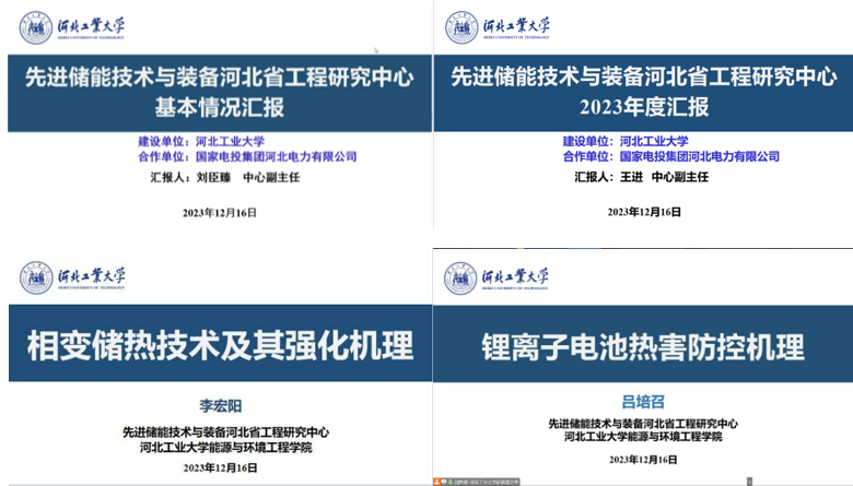 聘任仪式结束后,进行工程技术委员会第一次会议,会议由工程技术委员会主任委员杜小泽教授主持。工程研究中心副主任刘臣臻教授首先从建设背景及意义、建设单位与合作单位基础、研究方向及平台建设内容、创新团队建设情况、管理模式与运行机制及辐射带动作用等几个方面对研究中心基本情况做了详细汇报。工程研究中心副主任王进教授做了先进储能技术与装备河北省工程研究中心2023年度工作相关汇报,向工程技术委员会专家具体介绍了本研究中心的工作进展、主要成果及下一年度工作规划。青年教师李宏阳和吕培召分别做了题为《相变储热技术及其强化机理》和《锂离子电池热害防控机理》的研究进展汇报。
